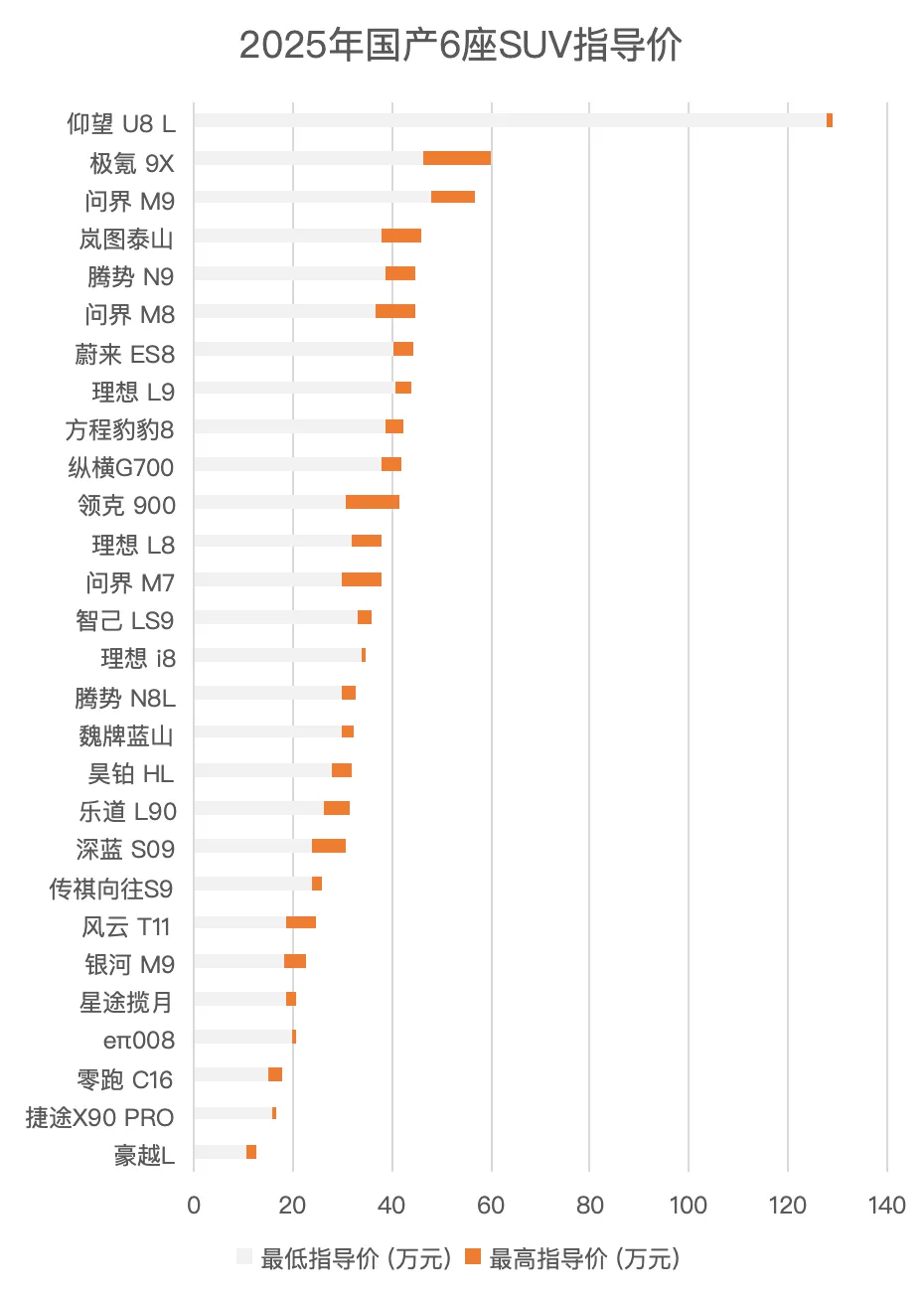 上期我统计了2025年国产6座SUV的上新情况,提到去年平均每13天就有一款新的国产6座SUV上市。在这些车型里面,最贵的比亚迪仰望U8L指导价130万,最便宜的吉利豪越L低配指导价11.99万,二者价格相差10倍。同样是国产6座SUV,价格差距为什么这么大呢?除了尺寸外,动力参数也是重要的因素之一。这次我统计对比了2025年国产6座SUV的动力参数,分享给感兴趣的读者。