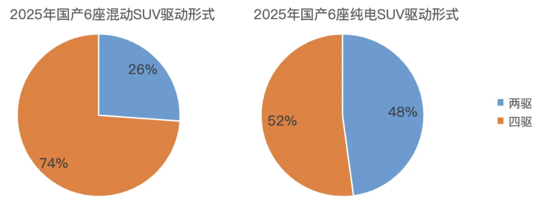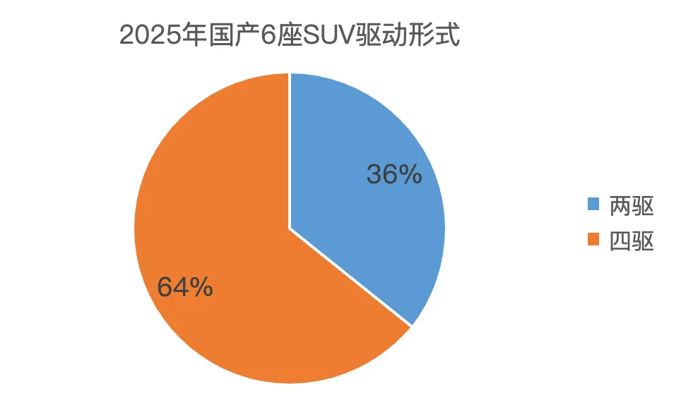 不区分能源形式的话,接近三分之二的国产6座SUV是四驱,占比64%。