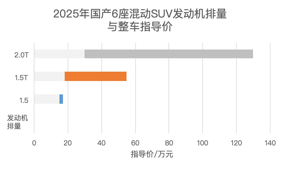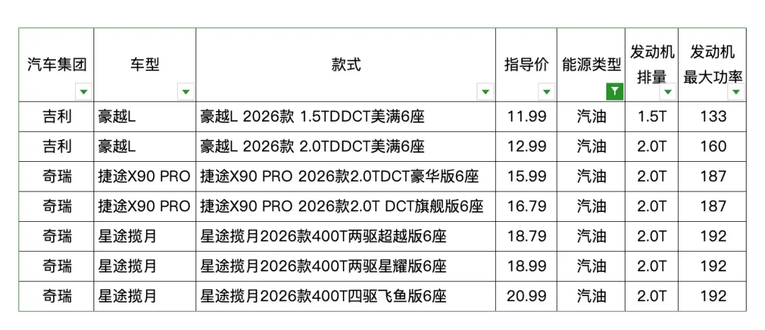 刚才提到说国产6座SUV里面燃油车已是“小众产品”。从下表可以看出,只有2个汽车集团的3个车型是燃油车,分别是吉利豪越L、奇瑞捷途X90 PRO和奇瑞星途揽月,共7个配置。这些车型的发动机排量和功率都不错,均是1.5T或2.0T,最大功率133~192kW。但与混动车相比,其动力系统最大功率处于较低水平。指导价最高20.99万,也只相当于混动SUV的低端产品指导价。
