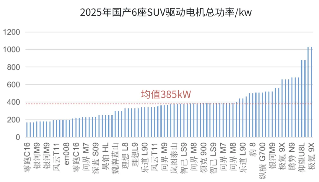驱动电机的平均功率为385kW。最大为极氪9X的3电机1030kW,最小为零跑C16的单电机170kW。二者相差5倍!