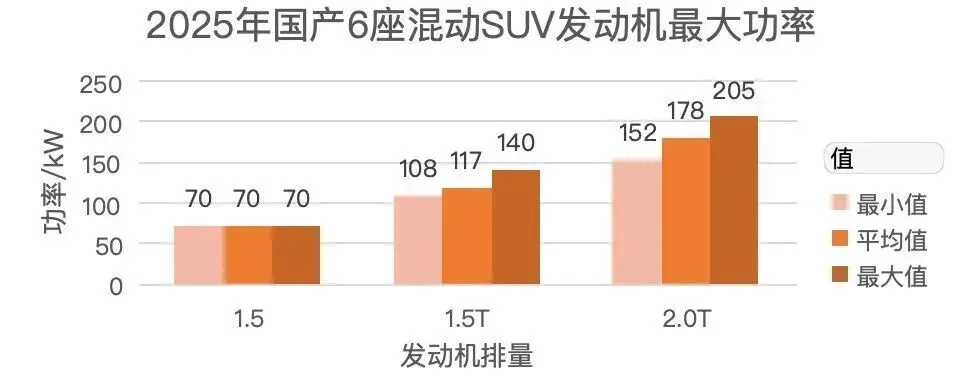 混动车型中66%的发动机排量为1.5T,29%为2.0T,仅5%为1.5。功率范围70~205kW。
