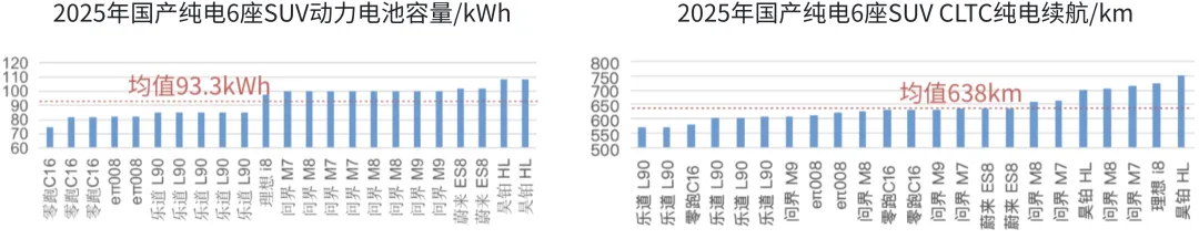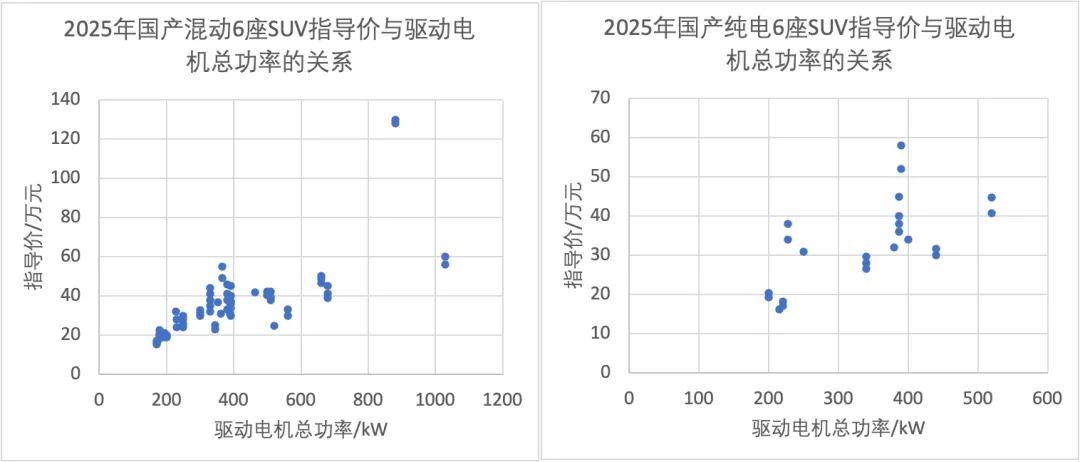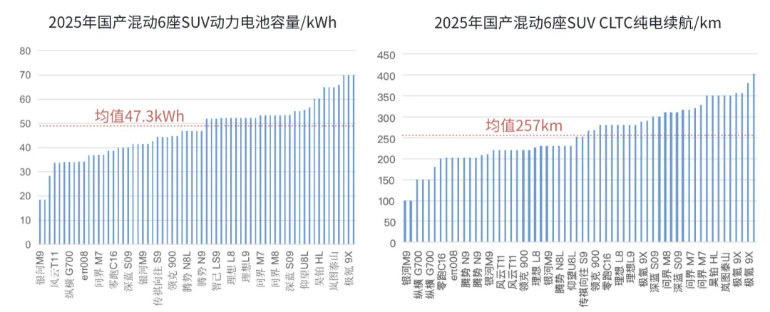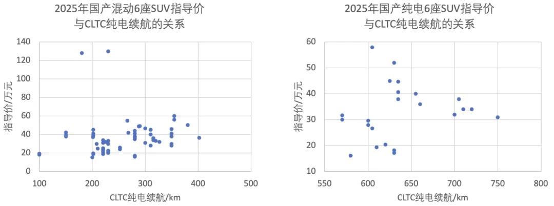 不过就跟驱动电机总功率越大,指导价不一定越大一样,指导价跟纯电续航的关系也仅仅是趋势相同,但不绝对。2025年国产混动6座SUV的均价是36.6万,对应的CLTC纯电续航小至200km,大至400km,均有覆盖。纯电SUV的均价33万,CLTC续航范围600~750km。