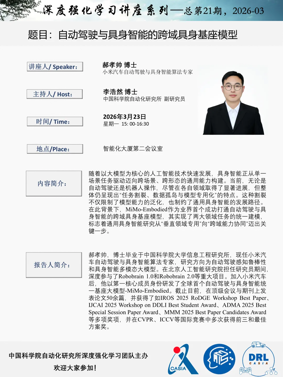 本次深度强化学习讲座系列,我们荣幸地邀请到 小米汽车自动驾驶与具身智能算法专家郝孝帅博士,向我们介绍最近关于自动驾驶与具身智能的跨域具身基座模型相关工作。