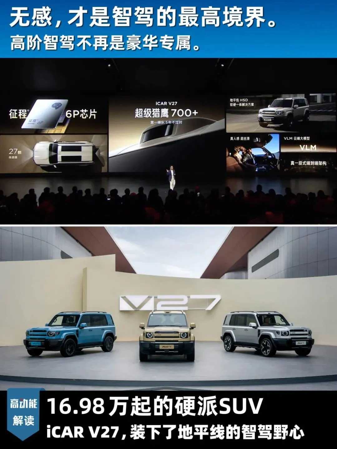 正因如此,“重越野、轻智能”成为了硬派SUV曾经的潜规则,智驾功能往往沦为营销话术中的“选配点缀”。但iCAR V27选择搭载地平线征程6P芯片与HSD全场景辅助驾驶系统,将560TOPS算力与一段式端到端架构塞进这个“方盒子”,并喊出“城野皆好开”的口号。这不仅是产品定位的差异化,更是一次对高阶智驾技术边界的压力测试——当智驾系统从规整的城市道路走向充满不确定性的越野场景,它是否还能保持“老司机”般的从容?