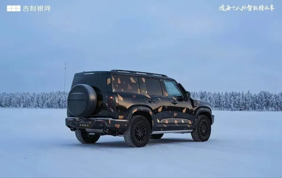 先看外观,那股子硬朗劲儿扑面而来,标准的“方盒子”造型,外挂备胎+竖向尾灯,一看就是能豁得出去的硬派主儿。前脸采用半封闭格栅,搭配点阵式圆形大灯,点亮后辨识度拉满,下包围更显粗犷,彻底告别花里胡哨。车身侧面线条平直,方形外后视镜+传统门把手,实用又耐看,配合凸起的轮眉,肌肉感十足。更狠的是,它已在北欧完成极寒冬测,车顶激光雷达就位,高阶智驾安排上,颜值与实力双在线。