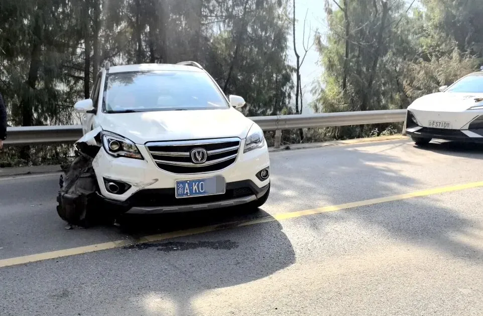 碰撞发生后车辆横停在了道路中间,车辆右前方损毁严重,路侧护栏也被撞坏,车上两名乘客在碰撞中轻微受伤。但值得庆幸的是,因驾乘人员均规范系好了安全带,事故并未造成更严重的后果。