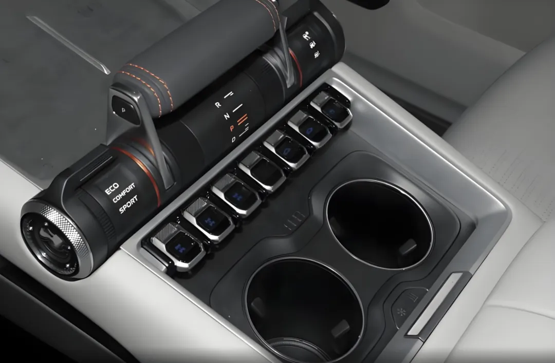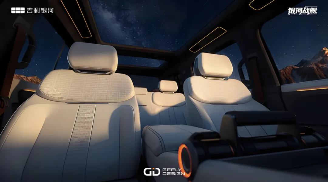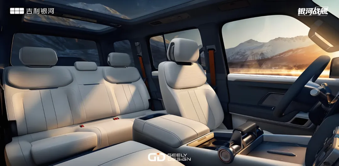 内饰设计上,银河战舰700将硬派实用功能与中式美好生活寓意相融,强调越野场景下的操作便利性与乘坐舒适性。采用了大面积米白色软性材质、亮黑色钢琴烤漆饰板、黑灰色饰板的交替混搭,还加入了银色的金属元素,保留了广受认可的换挡杆设计,副驾和A柱等处加装了扶手,适合户外越野时乘客抓握。车内配备了五个真皮沙发座椅,支持加热、通风、按摩,多向电动调节,还带有头枕音响,舒适性更好。中控台配备了全液晶仪表、中控液晶屏以及副驾驶专属大屏,副驾驶屏幕可显示海拔、坡度、方向等越野关键数据,辅助领航。操控岛更加简约,配备了手机无线充电、杯架、USB接口、Type-C接口等等。
