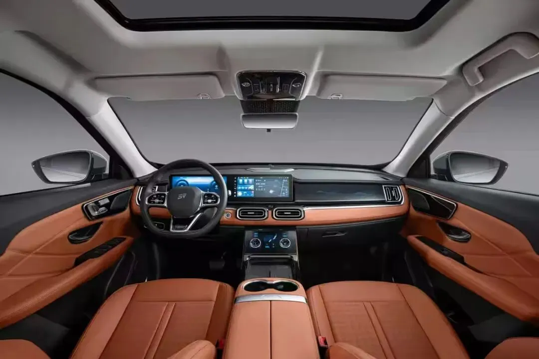 内饰黑棕配色,有30英寸悬浮式超大中控联屏、双辐式方向盘、悬浮式液晶仪表、全景天窗等,副驾可能会采用零重力座椅。