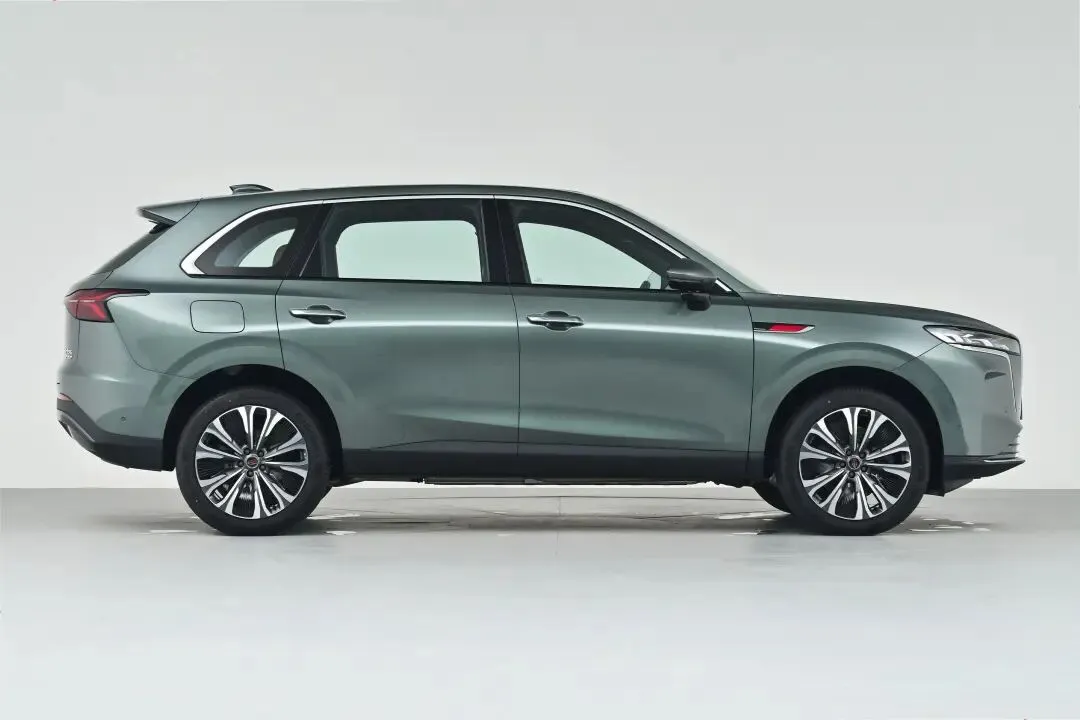 车侧型面饱满有力,4925mm车长、1970mm车宽搭配2925mm轴距,在同级别车型中尺寸占优。车顶线条从B柱后微微下溜,避免了大型SUV的呆板感;贯穿前后的腰线勾勒出清晰肌肉感,视觉效果硬朗。门把手采用传统外拉样式,未跟风使用隐藏式设计,看似普通却暗藏实用性——北方冬季气温极低时,隐藏式门把手易结冰故障,传统样式可避免此类问题。
