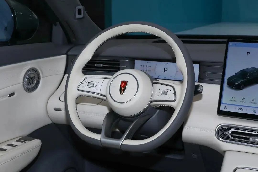 阶梯式中控台触感出色,大部分区域采用软性材质包裹,缝线工艺工整,中间搭配纹理饰板,下方辅以皮革包裹,软硬材质分布合理。8.88英寸仪表盘显示信息全面,车速、电量、油耗等关键数据清晰可见。双色三辐式方向盘握感饱满,多功能按键布局合理,支持盲操。