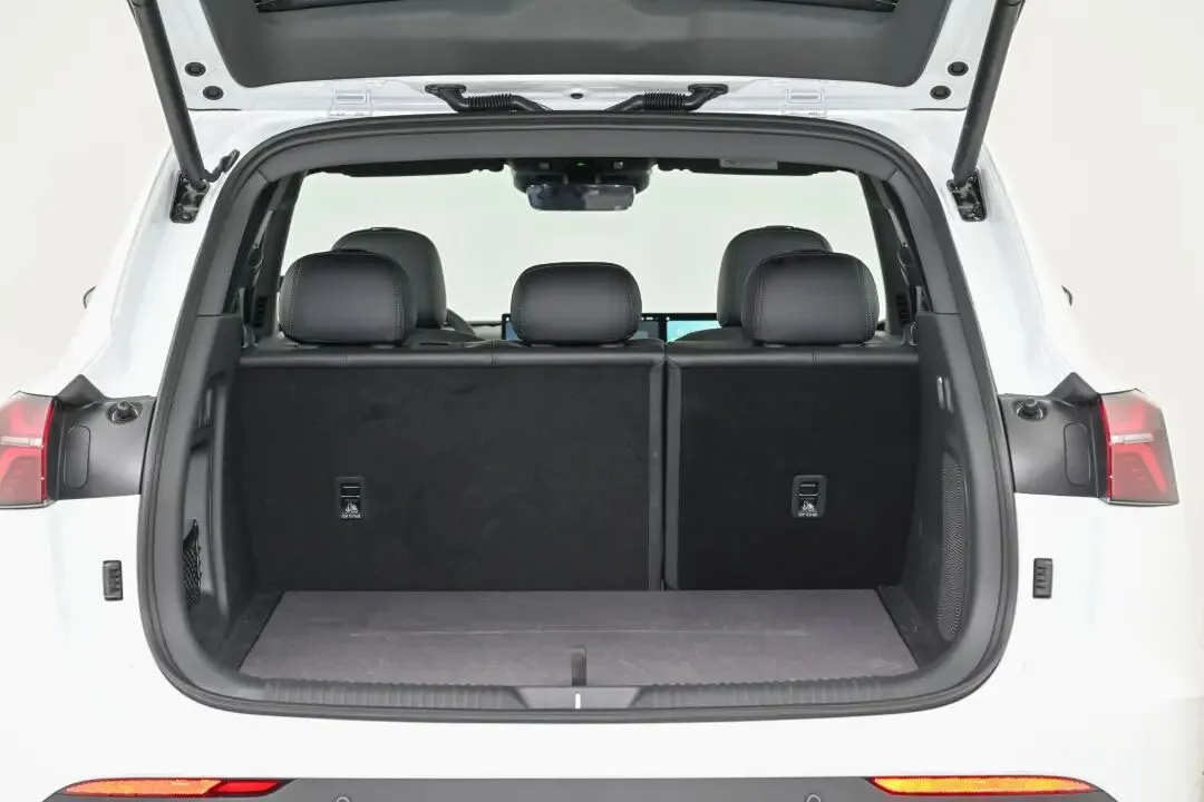 后备箱五座状态下容积503L,实测可竖直放置两个28寸行李箱、一个婴儿车,再搭配两个双肩包仍有剩余空间。需要装载大件物品时,一键放倒第二排座椅,空间可扩展至1977L,放倒后地板近乎纯平。后备箱下部设有49L干湿分离储物空间,带孩子海边游玩时可放置湿泳衣、沙滩鞋。