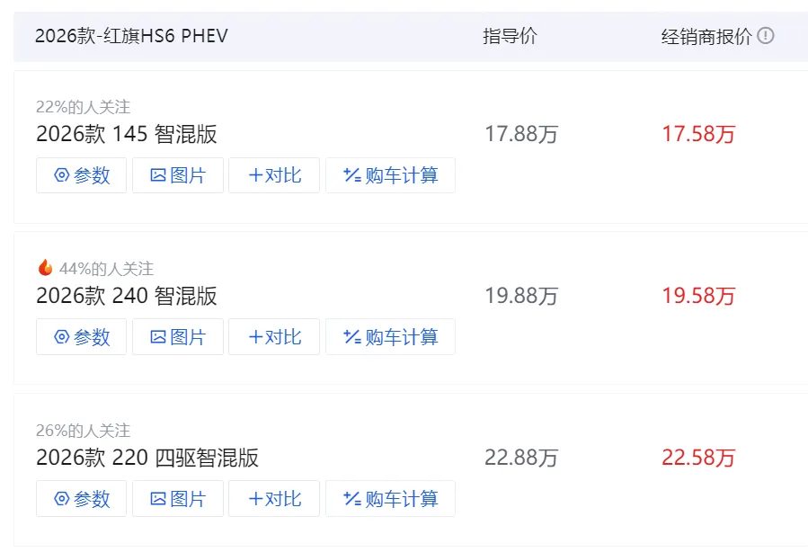 红旗HS6 PHEV全系三个配置,价格17.88-22.88万元。入门145智混版17.88万,23度电池适合日常通勤;中配240智混版19.88万,40度电池适配多数家庭;顶配220四驱智混版22.88万,适合需要四驱的用户。