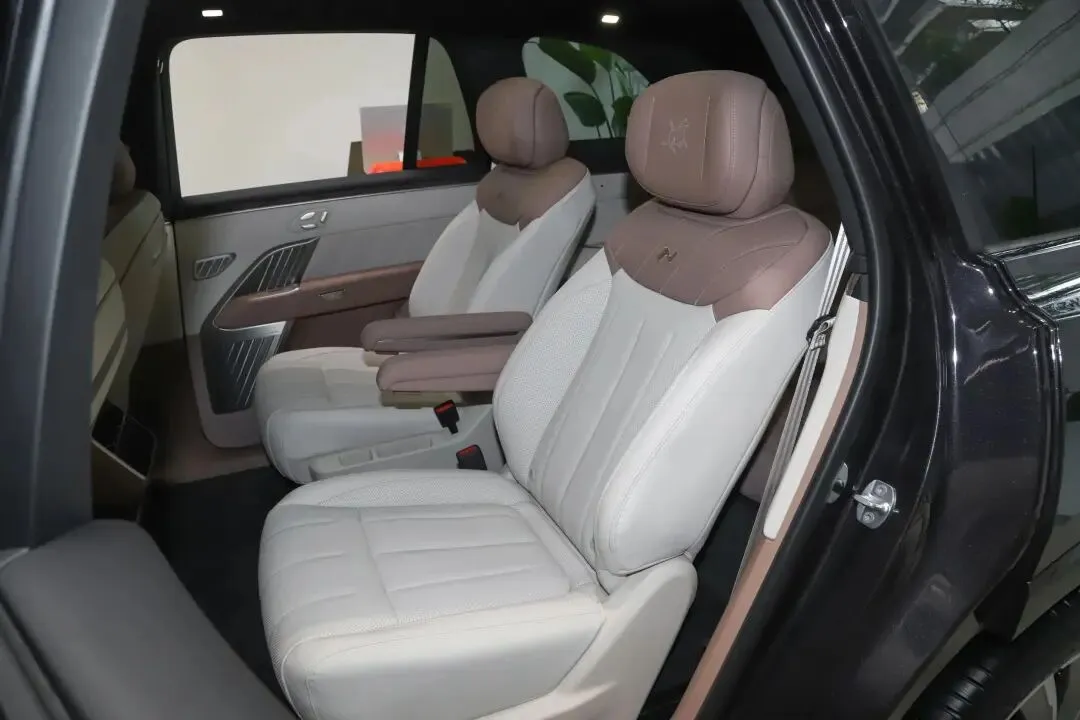 座椅用的是Nappa真皮,触感比较细腻。前排和第二排座椅都有加热、通风和按摩功能,主驾和副驾有记忆,高配版的第二排座椅还带电动腿托。座椅的填充物软硬适中,坐上去有陷入感,但两侧的支撑也还到位。皮质座椅在透气性上表现一般,好在通风功能能缓解一些长时间乘坐的闷热感。第二排配备了小桌板,给孩子放个平板电脑或者临时办公能派上用场。车载冰箱是标配,能加热也能冷藏,夏天喝个冷饮比较方便。后排还有两块屏幕,尺寸是17.3加8英寸,分辨率也是3K,旅途中给家人看看视频能解解闷。空调是三区独立控制的,后排乘客可以自己调节温度。