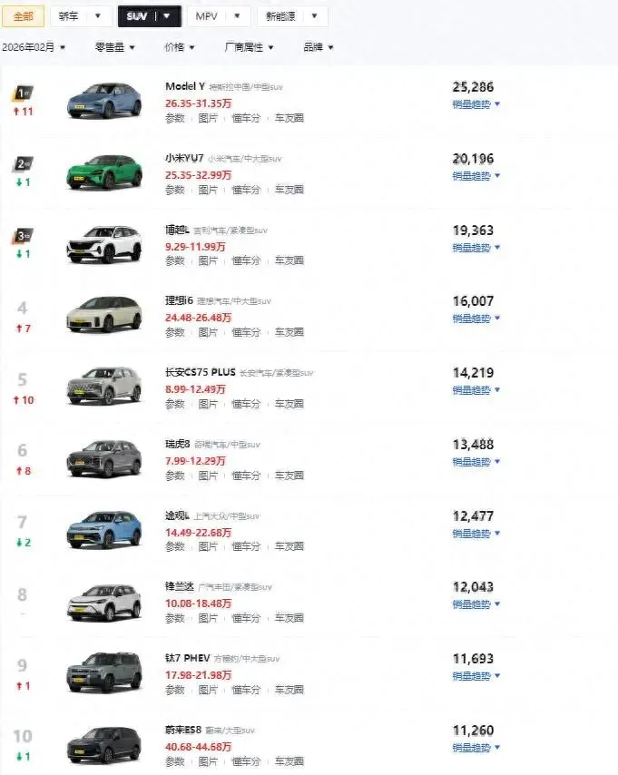整体来看,在2月SUV销量前十榜单中,新能源车型在头部市场继续领跑,特斯拉Model Y与小米YU7携手前进,而博越 L、CS75 PLUS等自主燃油车型则凭借性价比与实用性稳守市场,而其余车型均在各自细分领域保持了较强竞争力。这些车型共同构成了当下SUV市场多元共生、竞争激烈的格局,也为消费者提供了丰富的购车选择。