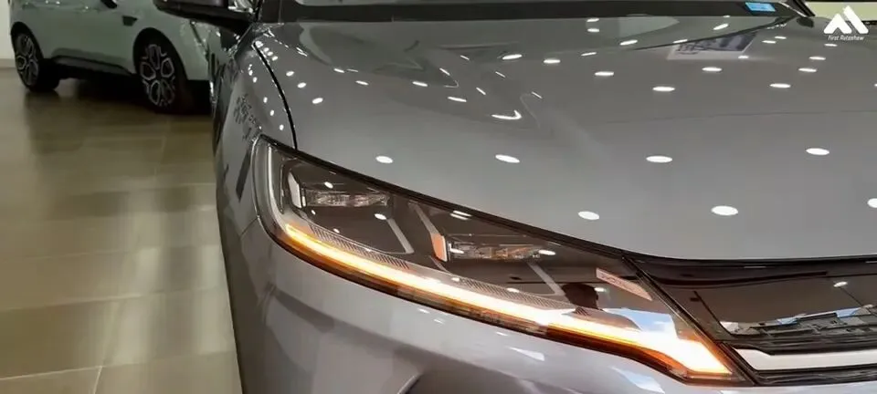 “展示比亚迪元UP的汽车前脸大灯。”
