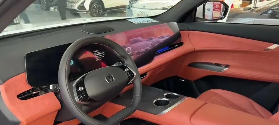 前脸是长安现在非常标志性的设计——无边界格栅 + 贯穿式头灯 +