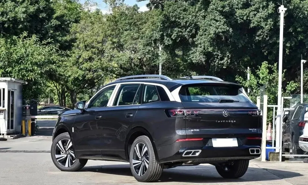 再来看车尾部分,全新揽巡减少了镀铬元素的使用,贯穿式尾灯进一步强化熏黑效果,内部灯腔调整为与新一代迈腾相似的组合设计,取代了现款激进的6个X状颗粒,整体风格更加简约精致。隐藏式排气设计虽然减少了燃油车的运动元素,但全新样式的后包围嵌入了大尺寸齿锯式扩散器并进行熏黑处理,营造出激进的运动画风。“小鸭尾”设计与贯穿式尾灯搭配,为车尾增添了鲜明的层次感。