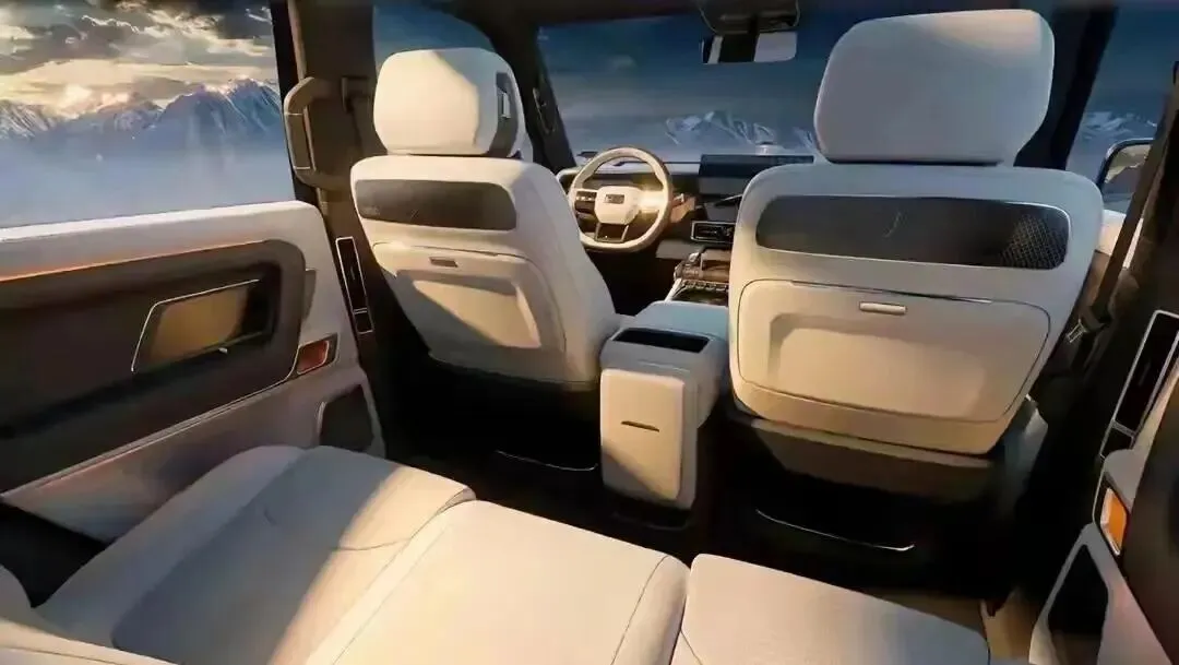 银河战舰700延续了硬派SUV经典的方盒子造型,平直车身线条、立式LED灯组、外挂式备胎与高离地间隙,勾勒出极具冲击力的越野轮廓。细节处却暗藏巧思:半封闭式格栅兼顾新能源科技感与硬派气质,机械式门把手在极端环境下更可靠,车顶行李架预留改装空间,满足露营、穿越等多元需求。内饰则以“飞机推杆式挡把”与副驾越野数据屏,将硬核实用与中式豪华完美结合。