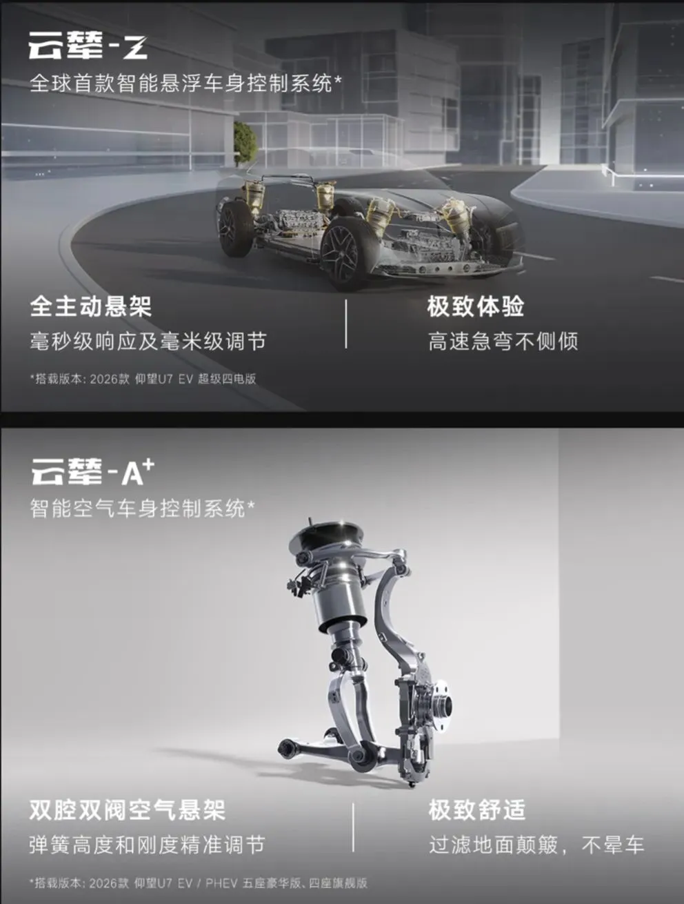 作为仰望U7的“底盘王牌”,云辇-Z是全球首款用直线电机替代传统液压悬挂的系统。它能实现负侧倾过弯,让车身在弯道中不仅不侧倾,甚至能反向“压弯”,驾乘人员仿佛“贴地飞行”。这种毫秒级响应、毫米级调节的黑科技,直接把豪华轿车的操控上限拉满。