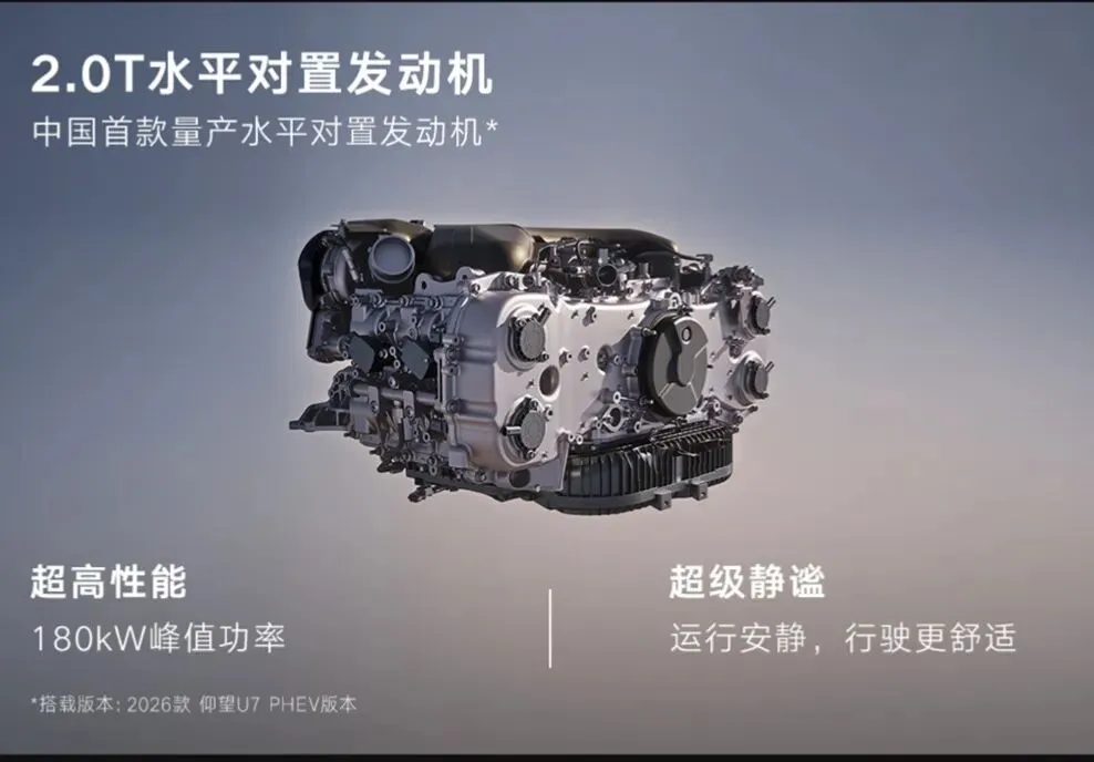插混版仰望U7搭载中国首个量产的2.0T水平对置发动机,这项被誉为“汽车工业皇冠明珠”的技术,让它在性能与平顺性上实现双赢,为插混车型注入强劲动力。