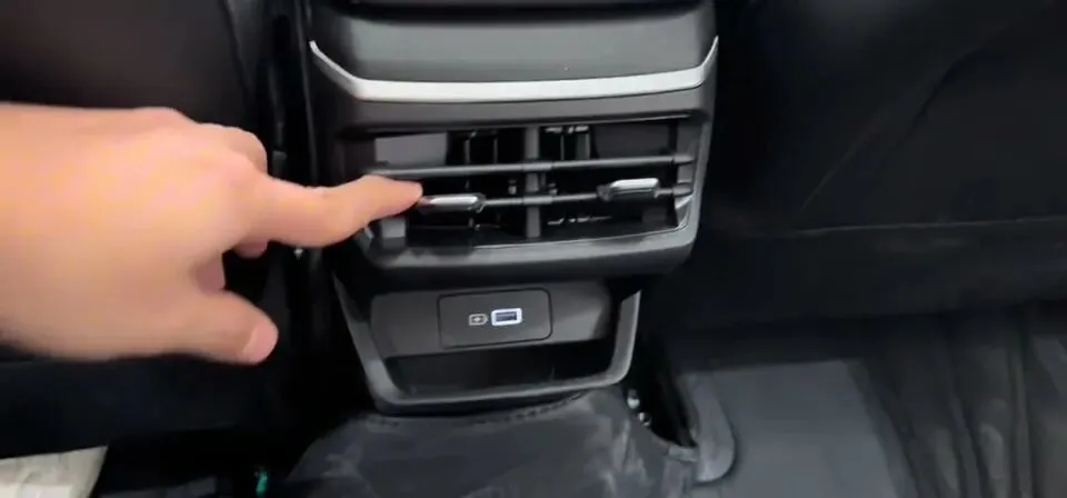 再到一些小地方:方向盘左侧是没有储物格的,这是它的手套箱的空间,带有主副驾的化妆镜,但缺少了一个化妆灯。这就是典型成本取舍;另外后排也没摆烂:后排配置这里有独立出风口,它是一个USB和一个小储物格。后排有出风口+USB,对家用党就是刚需。