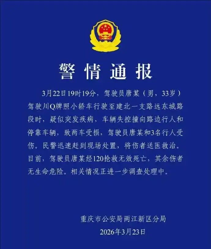 3月22日19时19分,驾驶员唐某(男,33岁)驾驶川Q牌照小轿车行驶至建北一支路远东城路段时,疑似突发疾病,车辆失控撞向路边行人和停靠车辆,致两车受损,驾驶员唐某和3名行人受伤。伤者已被送医救治。目前,驾驶员唐某经120抢救无效死亡,其余伤者无生命危险。相关情况正进一步调查处理中。