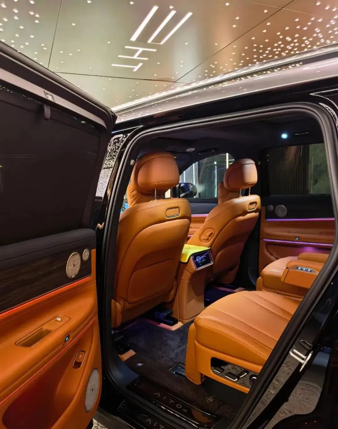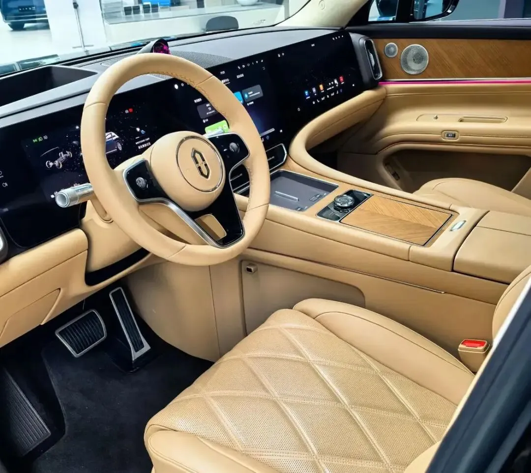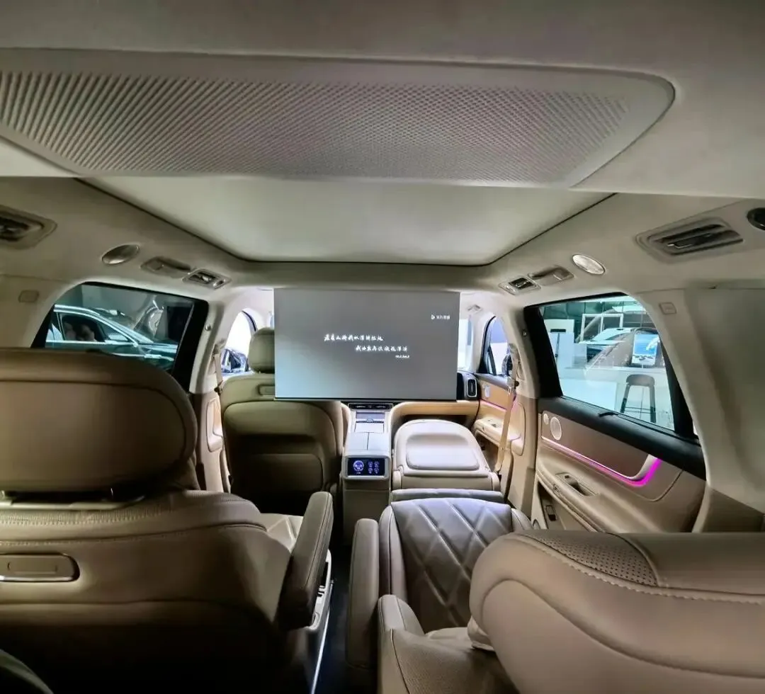 内饰主打轻奢环保与极致舒适,采用母婴级环保材质,无异味更健康。座舱搭载鸿蒙座舱4.0,三联屏+75英寸AR-HUD组成五屏交互系统,界面清晰、响应流畅,支持三指流转、可见即可说、语音连续控制,操作便捷。高配车型配备32英寸升降投影巨幕+25扬声器HUAWEI SOUND音响,打造移动影院。座椅采用Nappa真皮,六座版2+2+2布局,二排独立座椅支持加热、通风、按摩与零重力模式,搭配车载冰箱,后排舒适度拉满。车内储物空间丰富,后备箱容积宽敞,放倒座椅后拓展能力强,满足家庭出行与商务装载需求。