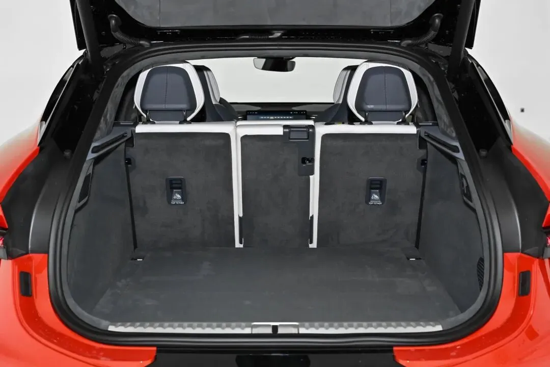 转到车身侧面,比例协调是最大的特点。宽大低矮的车身姿态,营造出了一种贴地、稳健的视觉效果。车顶线条从B柱之后开始优雅地下滑,形成一个大溜背的造型,但下滑的弧度经过了精心计算,以确保后排乘客的头部空间不受过多影响。悬浮式车顶设计、隐藏式的电动车门把手,都让侧面的光影曲面显得比较干净、完整。轮拱与侧裙处采用了粗壮的黑色防擦饰板,为这款强调公路性能的SUV增添了一丝野性与力量感。轮毂是双五辐的熏黑样式,内部显眼的红色刹车卡钳清晰可见,无声地诉说着其不俗的性能潜力。