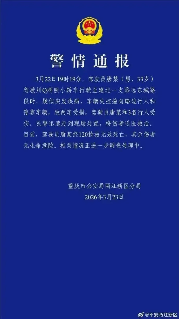 23日0时许,重庆警方发布了通报。通报显示,3月22日19时19分,驾驶员唐某(男,33岁)驾驶川Q牌照小轿车行驶至建北一支路远东城路段时,疑似突发疾病,导致车辆失控撞向路边行人和停靠车辆。事故造成两车受损,驾驶员唐某和3名行人受伤。民警迅速赶到现场进行处置,并将伤者紧急送往医院救治。然而,令人遗憾的是,驾驶员唐某经120抢救无效死亡,好在其余伤者目前无生命危险。