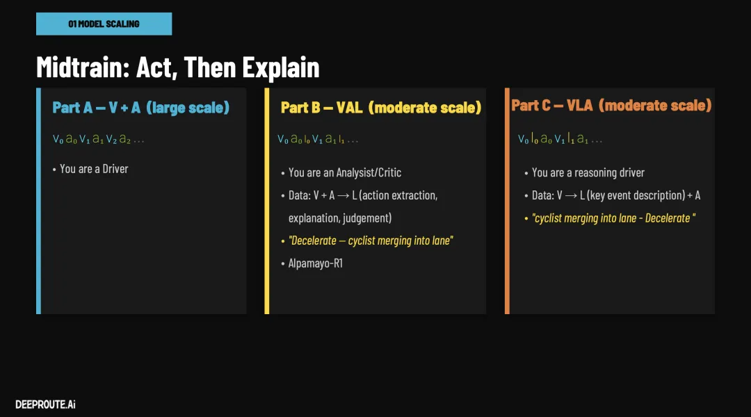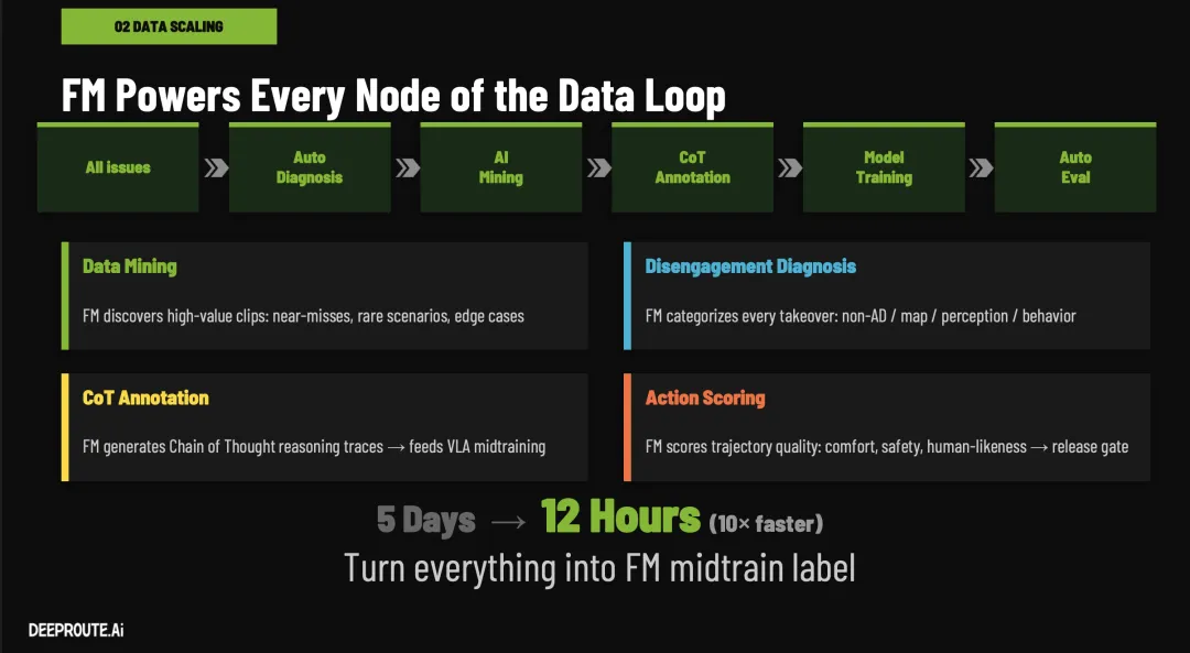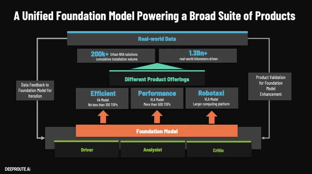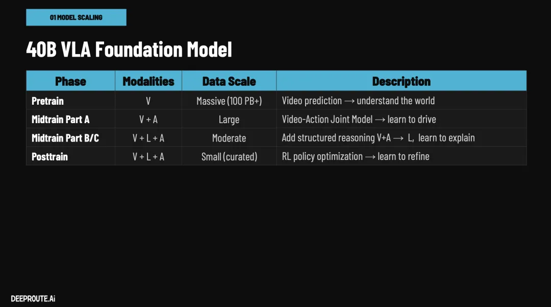 元戎作为中国辅助驾驶/自动驾驶算法供应商的后起之秀,在这两年来量产车辆大幅度上升,拥有长城、吉利、甚至传言拿下了新势力零跑的业务。而且元戎也是比较早喊“VLA”甚至量产"VLA"的供应商。所以,算是有量产也有前瞻的自动驾驶解决方案提供商,本次GTC 2026 元戎的CTO 曹通易做了名为《Redefining the Boundaries of Autonomous Driving with Foundation Model》的演讲,分享了其基于Foundation model基模的VLA方法和理论。本文通过演讲和行业知识分享下此次演讲的核心内容和亮点。元戎启行(DeepRoute.ai)解决自动驾驶,甚至走向 L5 级别的核心思路,是坚信“Scaling Law(扩展定律)”,通过构建统一的基座大模型来驱动模型尺寸和数据规模的同步爆发。这里也看出目前行业内对当前端到端发展起来的各种技术比较自信,看到了自动驾驶的曙光,目前行业的核心重点是,优化算法也加大模型参数、推动算力芯片上升、优化工程落地。以下是元戎其基座大模型架构与自动驾驶软件方法的硬核技术亮点:元戎基于1亿Gb的视频构建了一个参数量为 40B 的原生 VLA(视觉-语言-动作)大模型, 小鹏也在去年年底表示其研发了基于2亿Clips(推断 大约10亿Gb数据)训练的72B(720亿)参数超大规模模型。元戎表示其训练机制和端侧部署上进行了以下底层创新:1. 架构创新:“三位一体”的模型角色这个大模型打破了仅作为“驾驶员”的单一设定。它在同一个模型中集成了三种能力:驾驶员、分析师以及评论员/裁判。这种能力复用不仅让认知和场景理解得以共享,还能有效提升驾驶任务本身的性能。解读就是这个模型能看懂视频等传感器输入数据流,推理和分析,最终给出结论好坏。2. 预训练(Pre-train)原理突破:从“轨迹监督”转向“视频预测”传统的端到端模型通常依赖驾驶轨迹进行监督训练,但这存在极大的数据浪费——1 PB 的驾驶视频中,轨迹数据仅占约 10 GB,数据利用率仅为 0.001%。元戎在预训练阶段创新性地采用了视频预测任务来让模型理解世界,这意味着视频的每一个像素都能作为监督信号,数据利用率达到 100%,从而为超大参数模型提供了极高质量的物理世界表征。3. 中端训练(Mid-train)的跨模态推理融合在掌握了对世界的理解后,模型会进行三种核心任务的联合训练:V+A(视觉+动作):学习常规的端到端驾驶,典型的端到端架构。V+A -> L(行动后解释):激活分析师和裁判角色,输入视觉和动作序列,输出对关键事件的抽象描述、行为因果解释以及好坏评判。V -> L+A(多模态逻辑推理):训练带推理能力的司机。给定视觉输入,利用思维链(CoT)让模型先输出关键事件的语言描述和决策逻辑,再输出具体的驾驶轨迹。元戎表示其引入了 KV Cache(历史特征免重复计算,这个理想在本次GTC也表示采用了,具体可以看我们理想GTC 2026文章)、多 Token 预测(MTP)、量化技术以及定制化的推理引擎,将包含 1000 个视觉 Token 和数十个推理 Token 的单步处理延迟严控在 60-85 毫秒以内。此外,基座大模型可以根据车端芯片算力进行灵活“蒸馏”:在 100 TOPS 平台上部署纯驾驶的 VA 模型,在 500 TOPS 平台上即可部署带有逻辑推理能力的 VLA 模型。在软件和数据工程层面,元戎彻底重构了数据闭环和仿真系统,解决了“无聊数据损害模型”和人工介入效率低下的行业痛点:1. 大模型全面接管的极速数据闭环传统的数据闭环(发现问题、诊断、挖掘、标注、训练)严重依赖人工或小型规则模型,一个循环往往耗时 5 天(100 小时以上)且能力无法沉淀。元戎直接利用前文提到的基座大模型(其分析师和裁判能力)接管了数据挖掘、自动诊断、思维链(CoT)标注以及动作评分等全流程。这不仅将闭环周期从 5 天极速缩短至 12 小时,更重要的是,闭环过程中产生的所有人工 Review 和机器标注结果,都会沉淀为大模型中端训练的新养料,实现 AI 能力的飞轮递增。2. 突破长尾场景的数据合成技术面对现实中难以收集的罕见高危场景(Long-Tail Scenarios),元戎采用了先进的生成式与合成技术:3D 重建与风格迁移:利用 Nvidia 的 3D GUT 进行高保真重建,并用 Cosmos 模型实现天气和光照的风格迁移,将一个白天的素材转化为雨天或夜间的变体。DiPIR 插入式编辑:这是元戎自研的技术,能够将生成的 3D 行人、骑行者或动物(如公路上突然窜出的羊)无缝插入到真实的道路视频中,并自动匹配光照和阴影,系统性地批量生成“极其危险且难以捕捉”的训练数据。3. 仿真环境下的强化学习(RL)自我进化在仿真回测中,元戎的模型不再单纯依赖人工标准答案(在极端场景下人类也很难标注出完美轨迹)。基座大模型可以在重建的仿真场景中自己“采样(Rollout)”出多条不同的驾驶解决方案(比如遇到违规加塞时,是选择体感不佳的急刹,还是选择横向避让)。随后,模型内部的“评论员(Critic)”会结合预设的安全和舒适度规则,对这些轨迹进行行为分析和评分。通过这种闭环强化学习(RL Policy Optimization)的持续迭代,模型能够在极其复杂的边缘场景中输出更安全、更精准的决策。以上就是元戎启行在本次GTC 2026分享的核心内容,欢迎留言交流更多核心背后的算法信息。参考资料以及图片