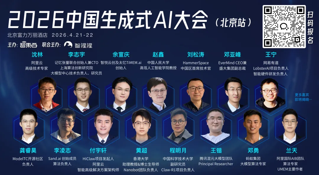4月21-22日,智猩猩主办的2026中国生成式AI大会将举行,设有开幕式,AI算力基础设施、大模型、AI智能体3大专题论坛,以及OpenClaw、LLM强化学习、大模型记忆等6场技术研讨会。其中,OpenClaw最强轻量平替nanobot团队负责人黄超、Claw-R1项目负责人程明月等学者专家将带来报告分享。