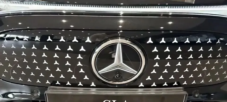 > “车辆前格栅细节展示,星辉点缀,中间是奔驰品牌LOGO。”