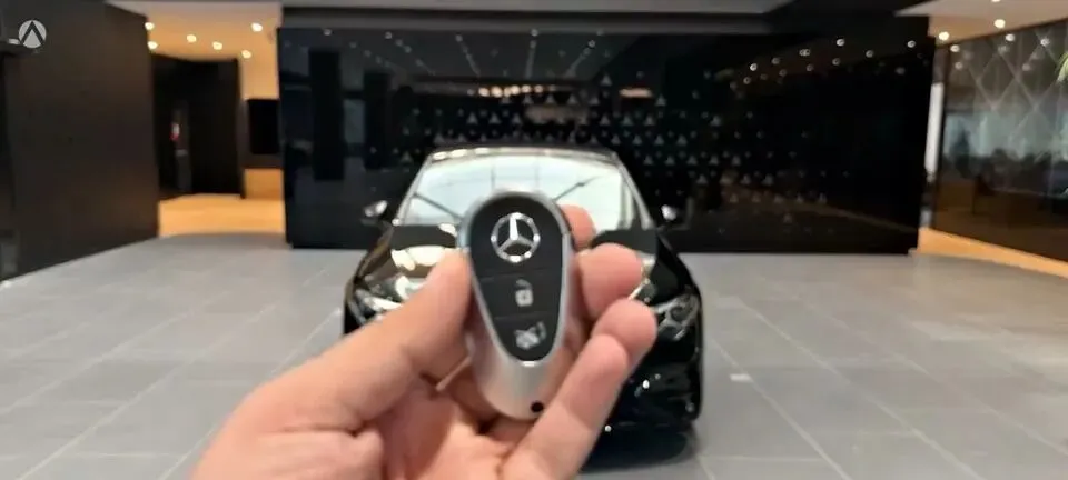 > “车辆钥匙展示,突出奔驰品牌标识。”