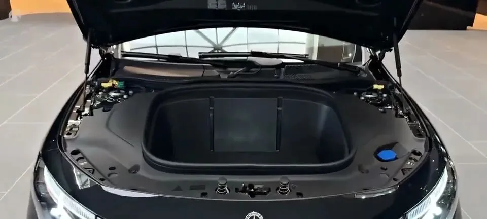 > “发动机舱盖打开,展示前备箱空间。”