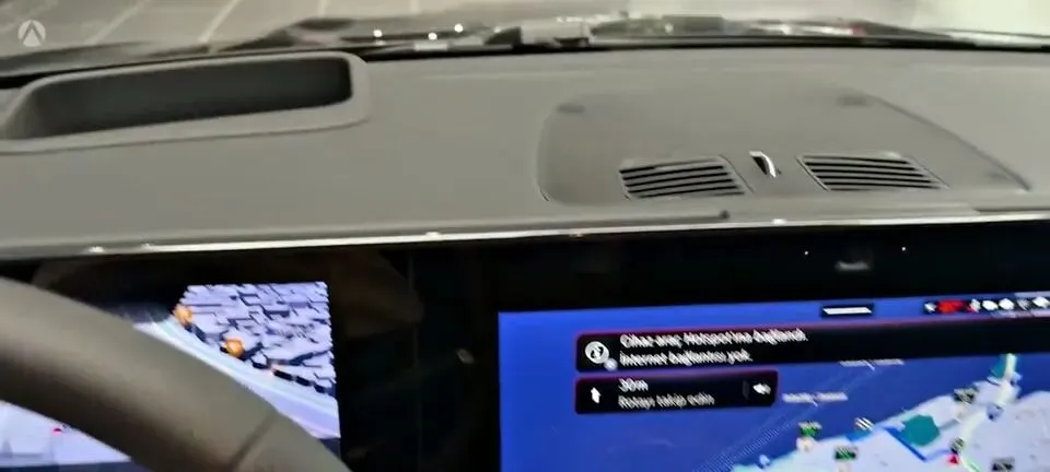 > “车内仪表盘和中控屏幕展示,显示导航界面。”
