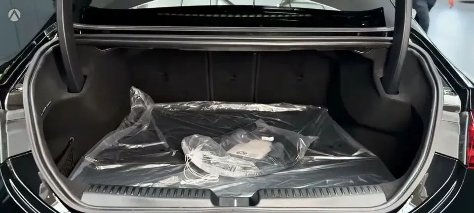> “后备箱打开,展示后备箱内部空间。”