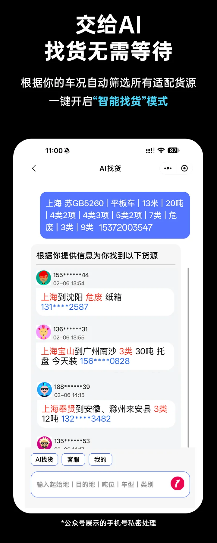 如果你想找不同的类别的货源,只需在底部输入框直接输入:车型、吨位、目的地、出发地,发送后AI会立即为你推送新的适配货源。