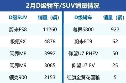 国人对“大尺寸”的偏爱,早已刻进购车DNA里。但高端大型车市场却上演着极端反差:D级SUV卖得热火朝天,D级轿车却在角落里无人问津,这场看似不合理的市场分化,其实藏着最真实的消费逻辑。从2026年2月的销量数据里,我们能清晰看到这场“冰火两重天”:- 蔚来ES8单月狂卖1.1万辆,极氪9X、问界M8等车型也稳定在三四千台,整个D级SUV赛道有近20款车型在售,堪称百花齐放;