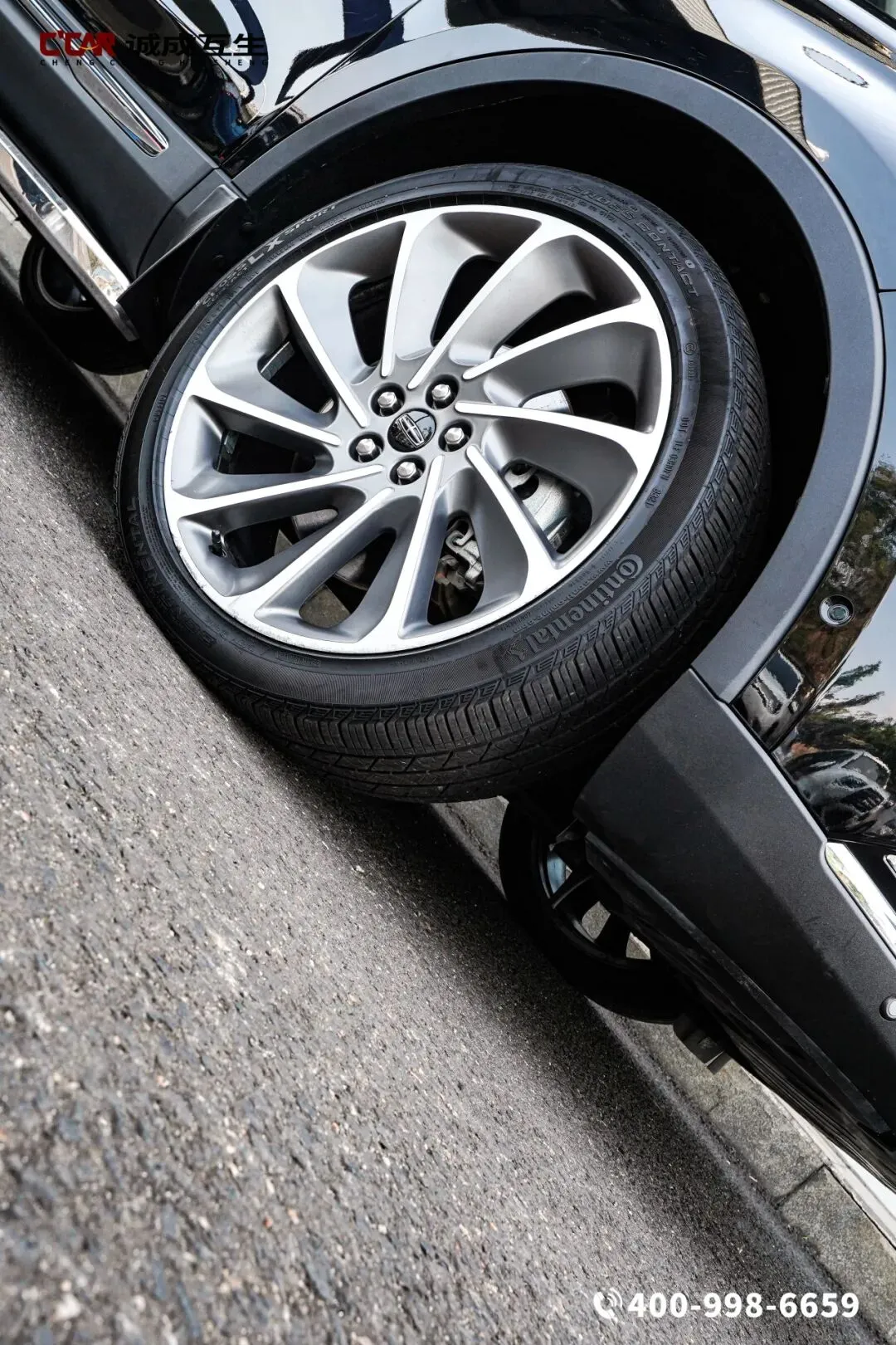 瀚金黑外观如深海凝萃的墨色漆面,在阳光下泛着细腻的金属光泽,沉稳中透着贵气,像一位内敛的绅士,不动声色间拿捏全场目光。标志性的星辉式星标形状镀铬件,如繁星般围绕中央的车标排列,在阳光下波光粼粼。修长车身搭配21英寸刀锋式大轮毂,轮毂辐条如利刃般凌厉,既凸显运动气质,又承载着稳健行驶的底气;腰线流畅舒展,勾勒出中型SUV的大气身段,停在路边便是一道风景线。贯穿式尾灯点亮后如星河串联,辨识度极高,尾部整体简约而不简单,尽显豪华SUV的从容质感。