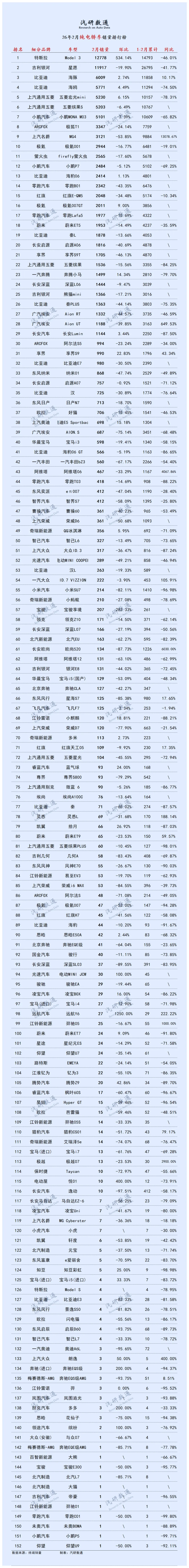榜单中腰部及尾部车型环比以下滑为主,多数车型环比降幅超10%,上汽名爵MG4环比降幅达53.85%,零跑B01环比下滑43.35%,多款热门车型销量回落明显。高端纯电轿车方面,极氪001、蔚来ET5等车型2月销量均未突破0.30万辆,环比同样呈现下滑态势。