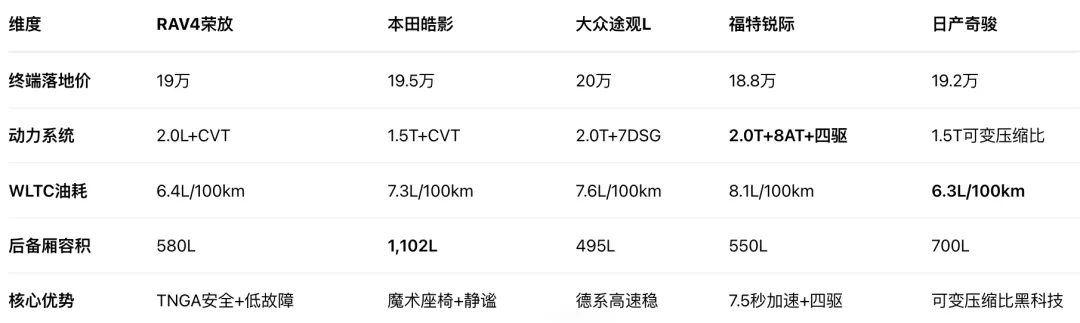省心耐用派 → RAV4荣放(19万级TNGA架构+<1%故障率,开十年真省心);