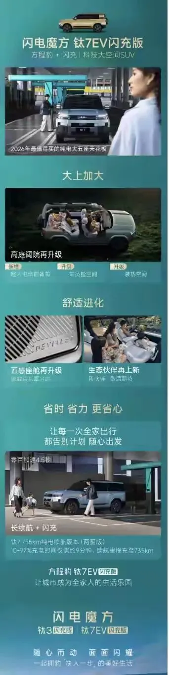 这辆车就是——方程豹钛7纯电版。3月5日,它在比亚迪第二代刀片电池暨闪充技术发布会上亮相,给大家带来了一场“硬派+纯电”的豪华盛宴。