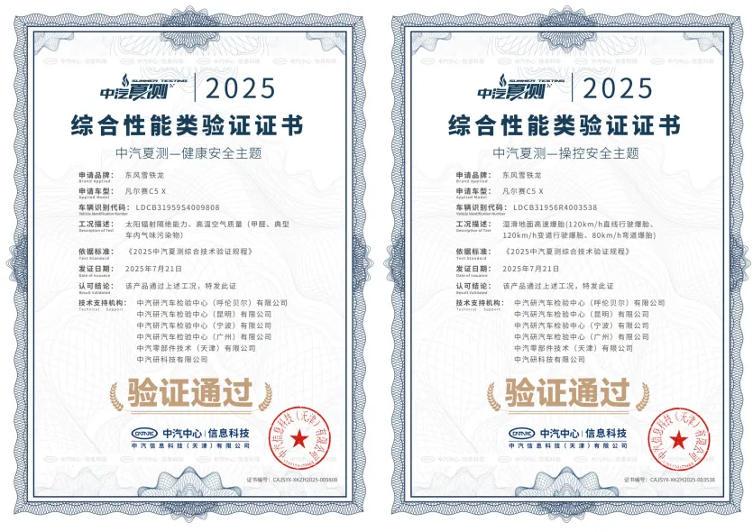 凡尔赛C5 X曾荣获中国十佳车身、C-NCAP五星安全认证、中汽研“驾乘品质之星”等权威背书。2023年5月,凡尔赛C5 X 挑战国内首次高速连环追尾主被动安全联合测试,以12项验证项目全部合格通过的优秀成绩,获得“3A”评价;2025年7月,在2025中汽夏测中通过太阳辐射隔绝能力、高温空气质量及湿滑路面高速爆胎三大测试项目,荣获健康与操控双安全权威验证证书;2025年12月,在中汽中心极寒驾控安全主题技术验证中,以140km/h时速在压实雪面完成前轮爆胎测试,在20%坡度的冰雪路面上满载状态一次登顶成功,获颁“操控稳定性挑战”认证证书。一系列硬核荣誉印证了凡尔赛C5 X经得起推敲的卓越品质。