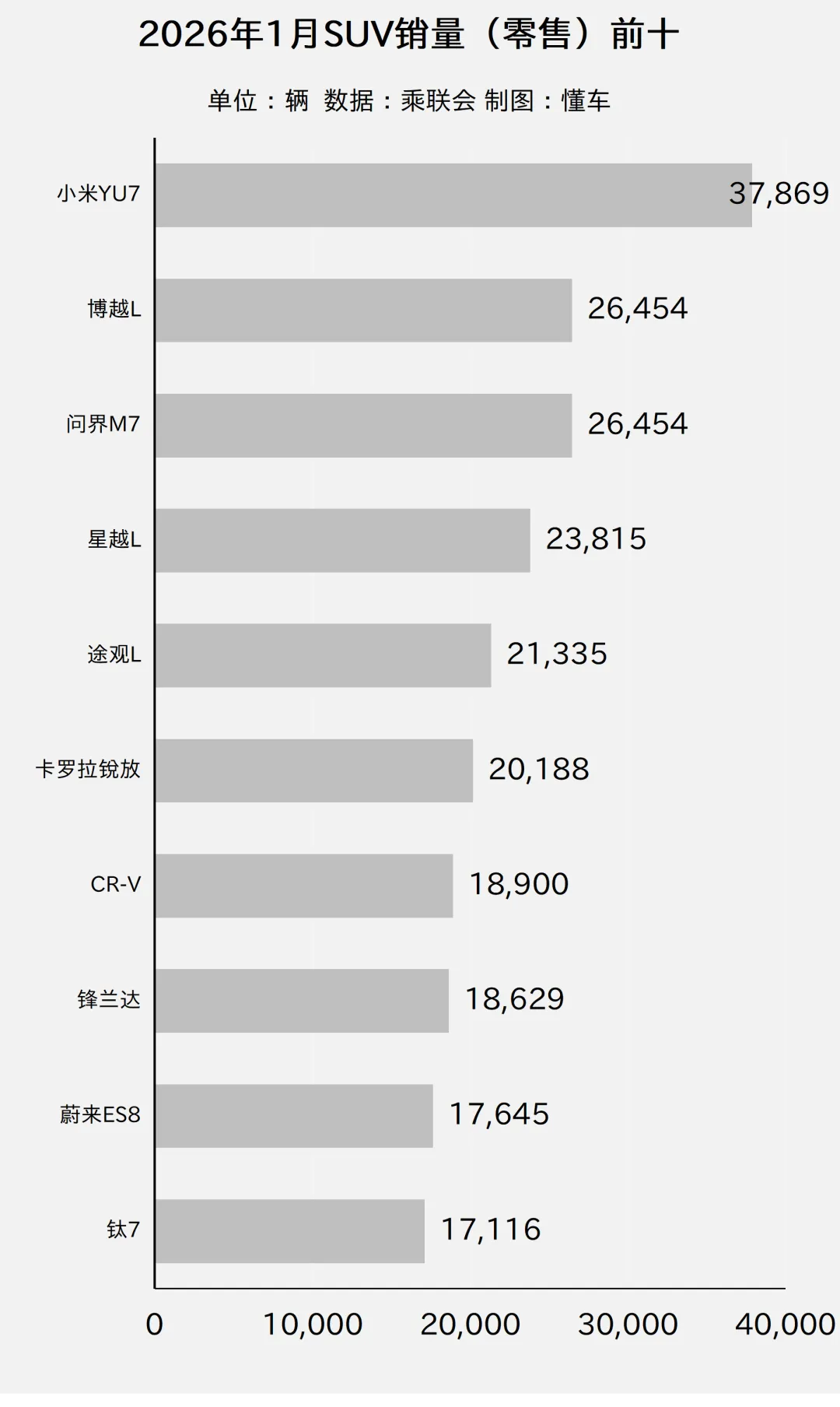 「1月SUV销量榜出炉,小米YU7成最大黑马,比亚迪竟无一台车进前十。」