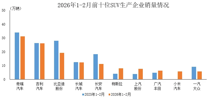 据中国汽车工业协会统计分析,2026年1-2月,销量排名前十位的SUV生产企业共销售133.4万辆,占SUV销售总量的64.5%。