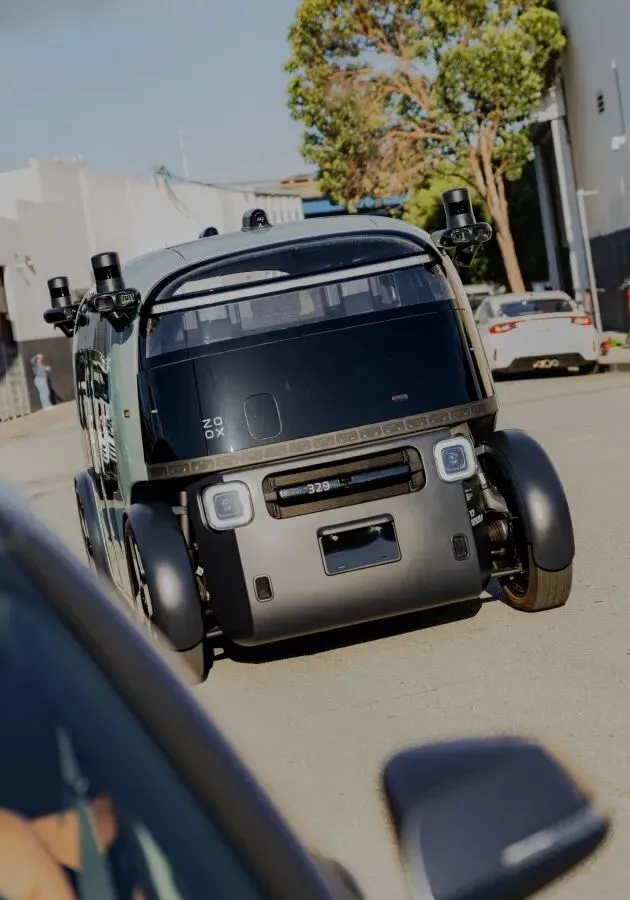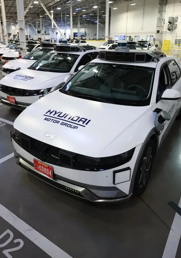 一辆由现代汽车支持的Ioniq 5无人驾驶出租车和一辆Zoox无人驾驶汽车。一辆由现代汽车支持的Ioniq 5无人驾驶出租车和一辆Zoox无人驾驶汽车。