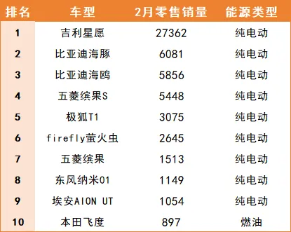 2026年2月轿车销量榜(小型车):新能源霸榜,仅一款燃油车挤进TOP10