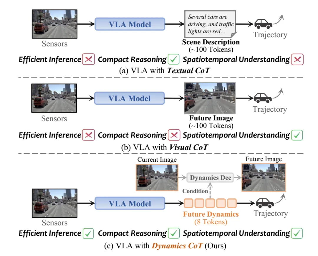 一类是 Textual CoT,即先生成类似前车减速、红灯亮起,因此应减速等待这样的文本 reasoning推理,再输出动作。这种方法虽具备一定可解释性,但语言天然难以表达连续的物理动态和细粒度时空关系,且效率低下,延迟太长。驾驶决策本质上依赖的是连续演化的动态世界,而非离散语言符号。