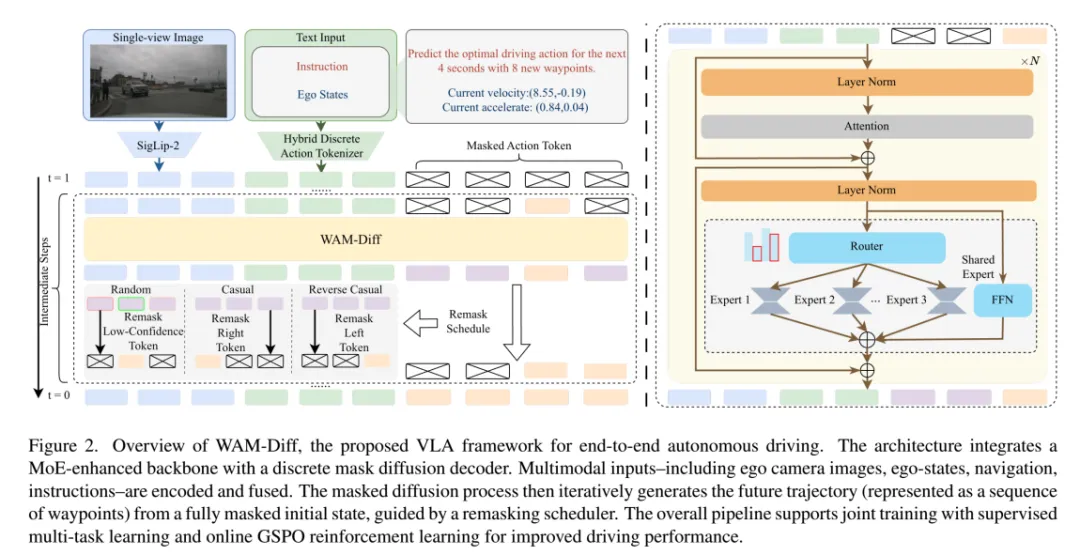 再次是2025年WAM-Diff: A Masked Diffusion VLA Framework with MoE and Online Reinforcement Learning for Autonomous Driving,关键的VLM是LLADA-V,主要合作单位是复旦大学。
