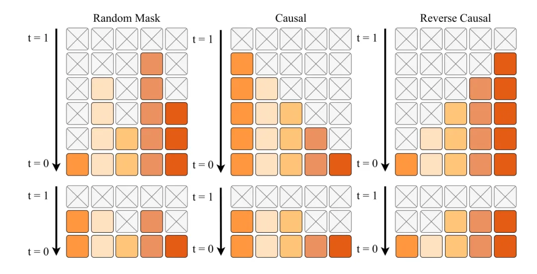 掩码扩散模型则像是在做一张全卷的填空题,它可以先填确定的部分,再根据上下文回头修改不确定的部分,甚至可以先确定终点,再反推路径。该框架将未来的车辆轨迹视为一个离散的序列。在训练阶段,模型会随机掩盖掉一部分轨迹点,让网络去预测这些缺失的信息。在推理阶段,模型从一个完全被掩盖(全Mask)的序列开始,通过迭代的方式,逐步将Mask替换为具体的数值或语义token。 这种机制带来了前所未有的灵活性。它支持并行解码,不需要像自回归那样排队等前一个结果,大大提高了生成效率。更重要的是,它打破了时间顺序的枷锁,允许引入非因果的解码策略。